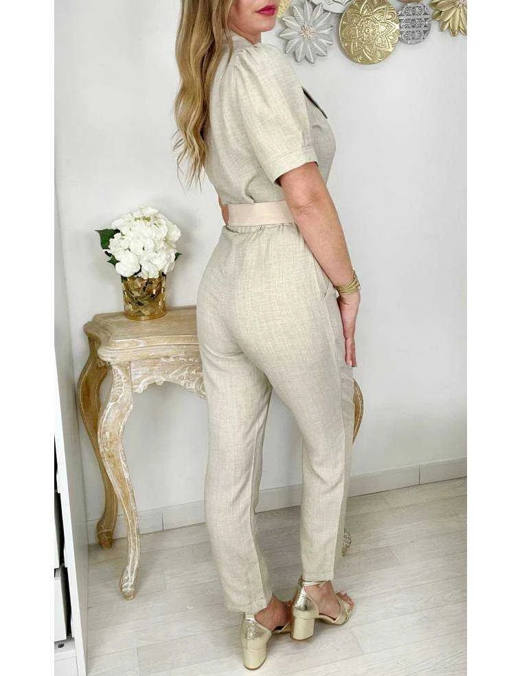☆ Combi pantalon style lin beige, boutonnée et manches courtes,deux poches et deux poches plaquées sur le buste,ceinture à nouer en tissu, elle se porte droite ou plus ajustée avec la ceinture portée par le mannequin et vendue dans la rubrique accessoires.