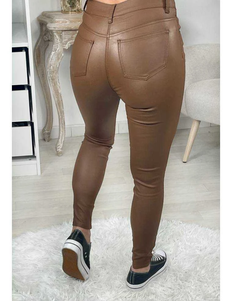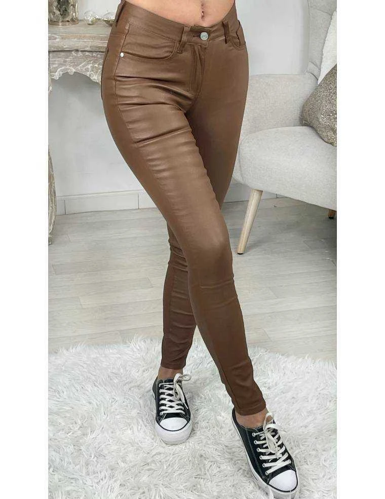 Jean camel taille moyenne, tissu style enduit , hyper souple et tissu agréable à l’intérieur, se ferme par un bouton et il se porte moulant.