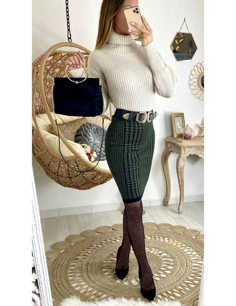 Jupe en tissus style tweed kaki et noire, bande noire sur le bas, elle se porte ajustée