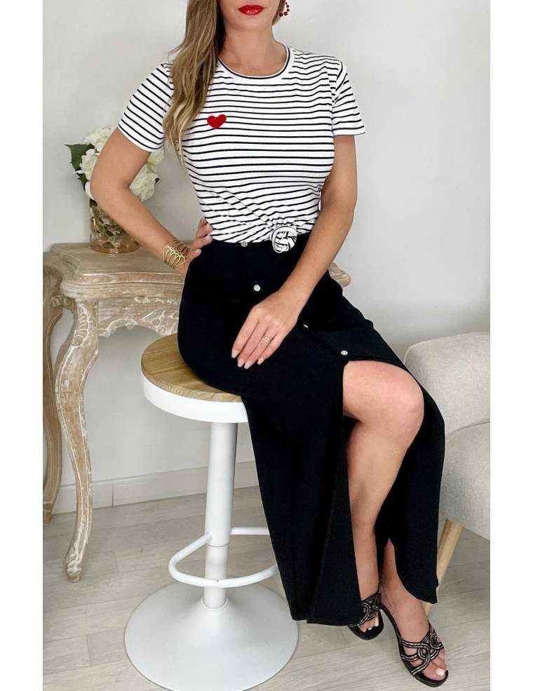 ☆ Jupe longue boutonnée et fendue noire, elle se porte droite.