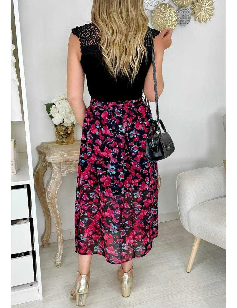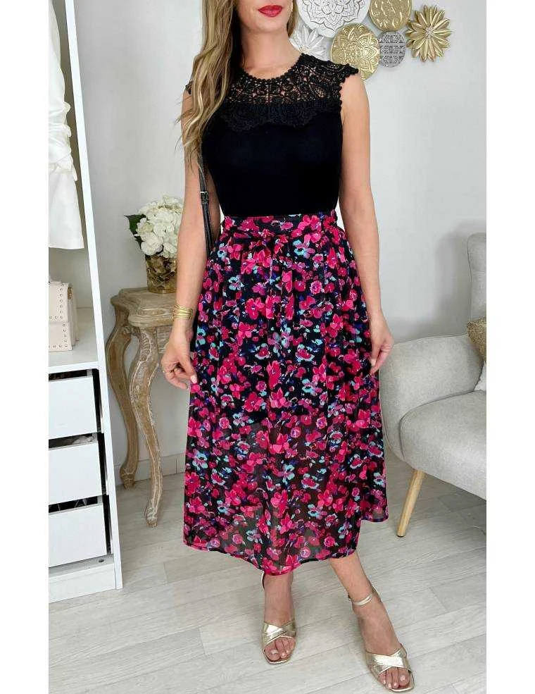 ☆ Jupe mi-longue en voilage et doublée, au fond noir et fleurs fuchsia et vert d’eau, touches gold, deux petites fentes sur les cotes , elle se porte droite.