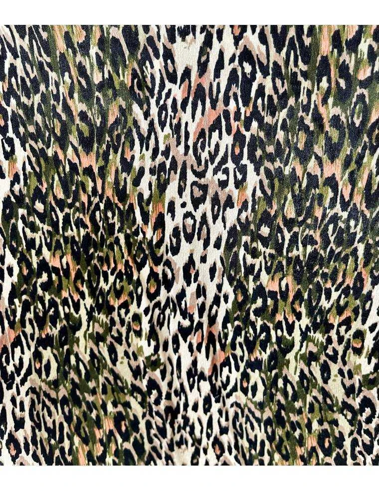 Blouse en tissu fluide au fond noir et imprimé orange et kaki léo, entièrement boutonnée, elle est légèrement plus longue à l’arrière et se porte droite.