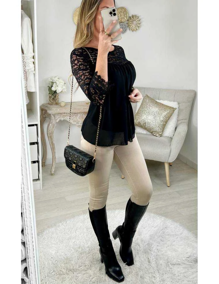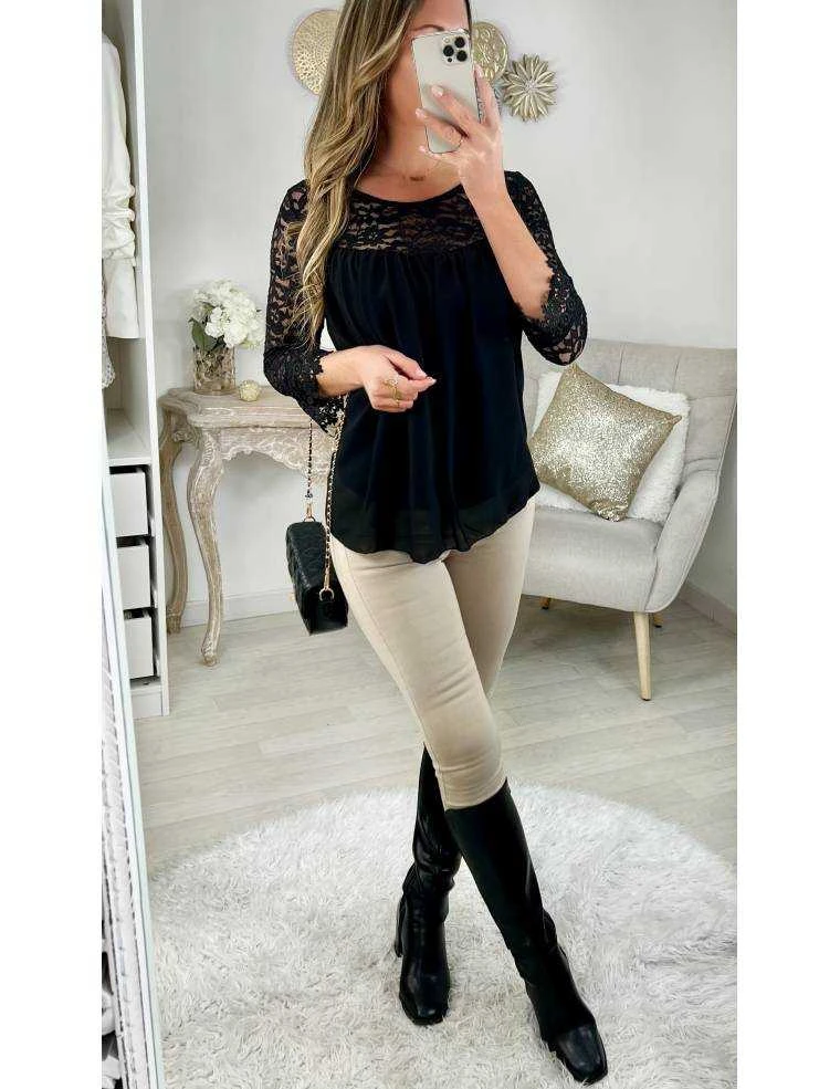 ☆ Blouse noire col rond et manches longues, dentelle sur le buste et les manches, les poignets sont brodés, elle se porte droite.