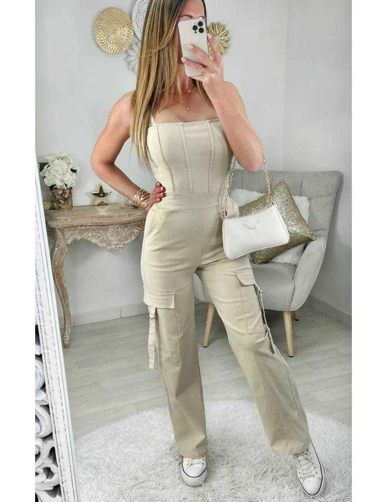 ☆ Combi pantalon beige, deux poches plaquées avec rubans pour resserrer, bustier à fines bretelles réglables , bas évasé , elle se porte droite.