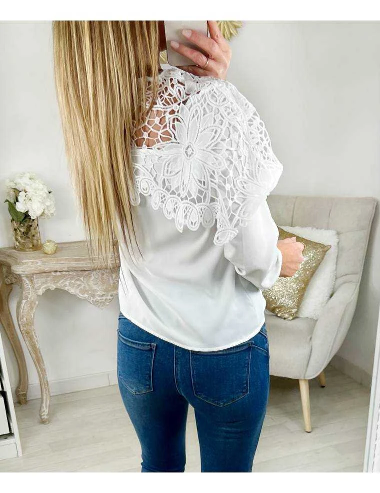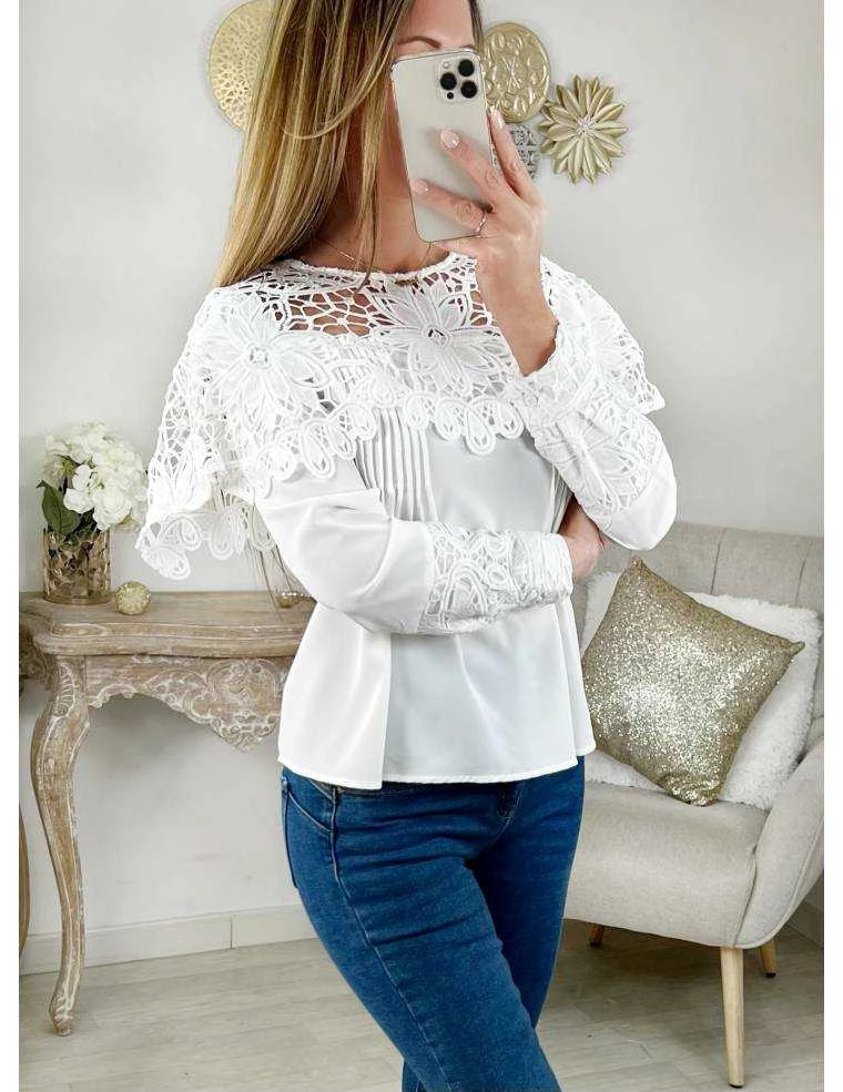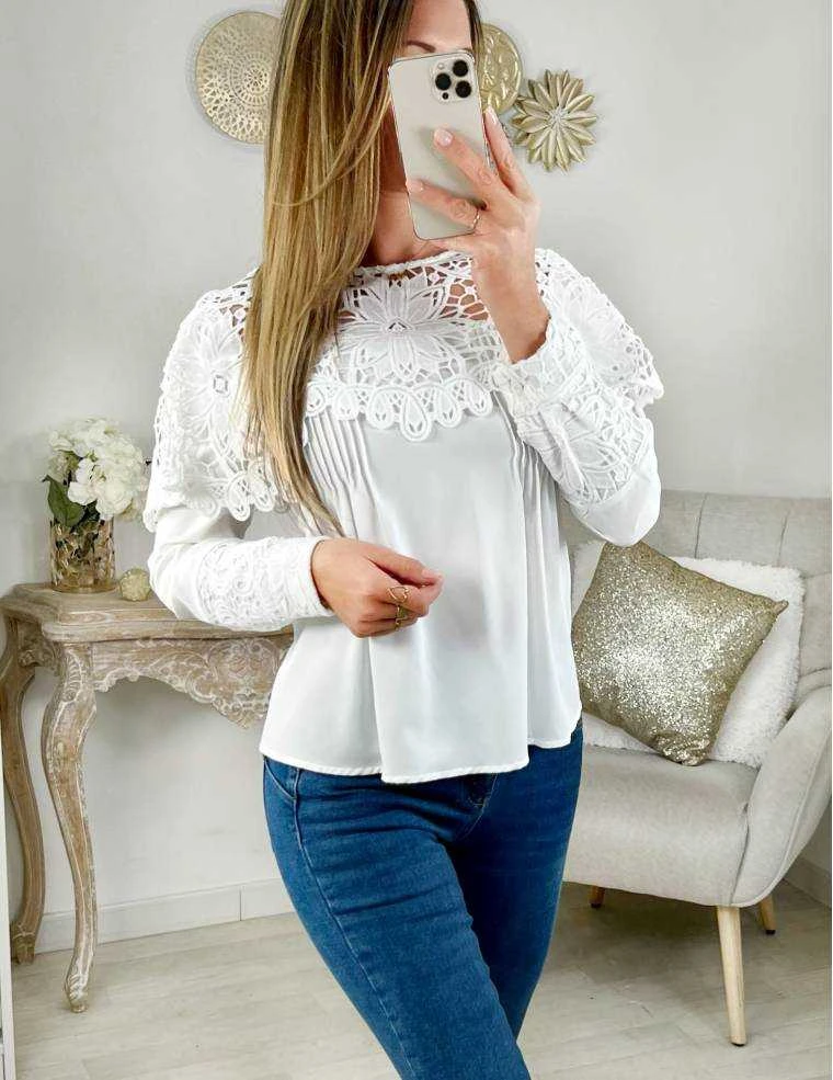 ☆ Blouse blanche, col et manches brodées, elle se porte droite.