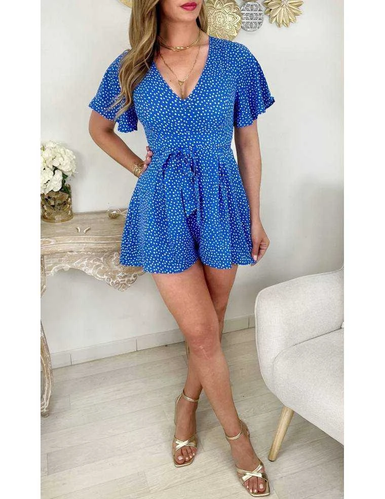 ☆ Combi short au fond bleu et petites fleurs blanches, col v, lien à nouer, se ferme par un zip dans le dos,, elle se porte droite.