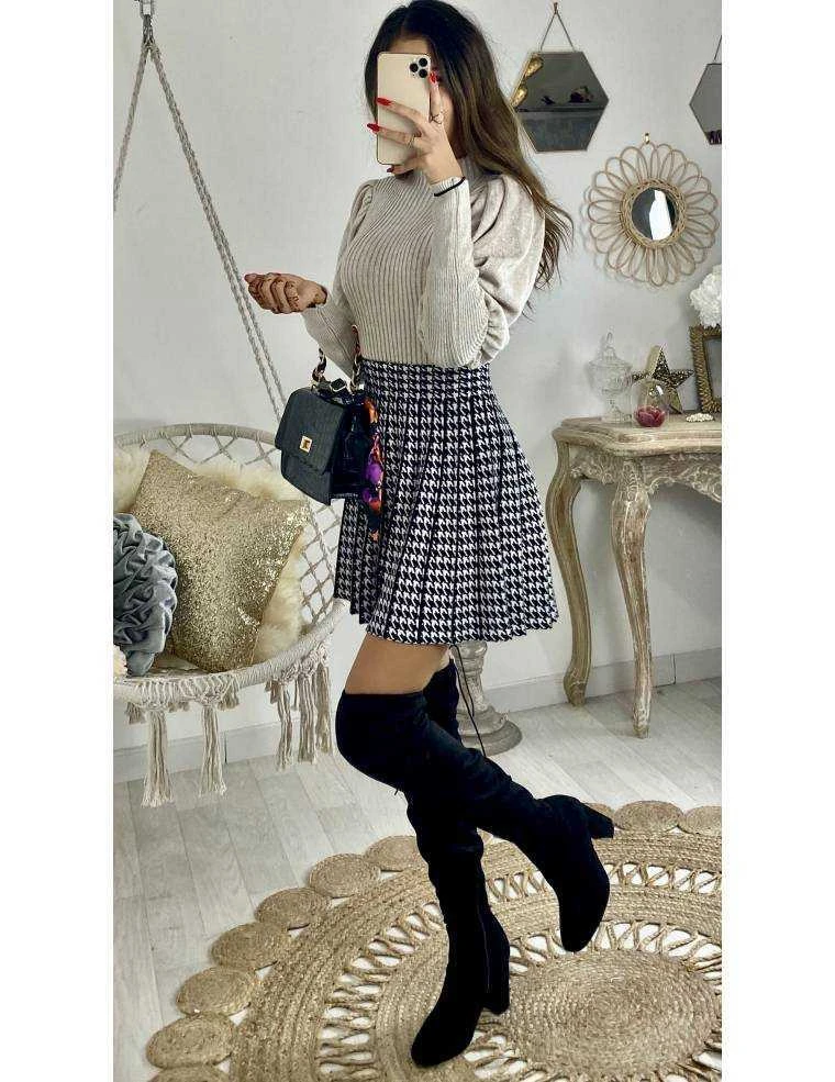 Jupe noire et imprimé pied de poule en tissus doux et épais, plissée et taille élastiquée.