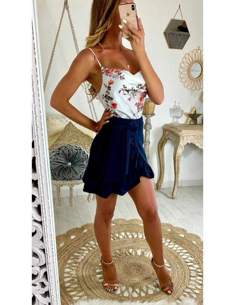 Jupe porte feuille bleue marine, volant sur le bas et lien à nouer sur la taille, elle se porte droite.