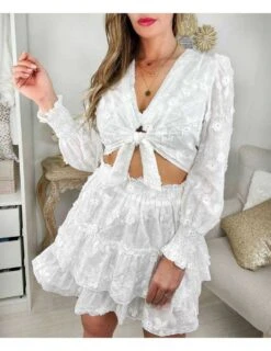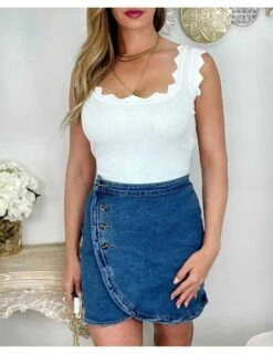☆ Jupe effet portefeuille & volants, à l’imprimé dans les tons bleus, ceinture à nouer, elle se porte droite.