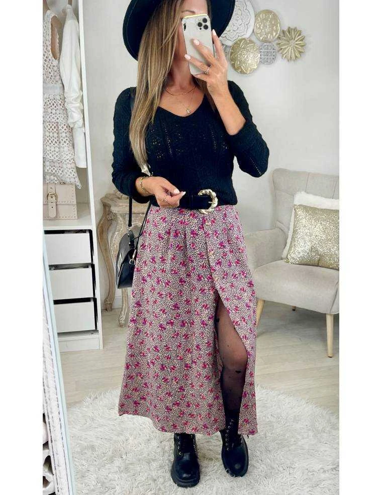 ☆Jupe longue entièrement boutonnée, dans les tons fleuris rose et purple, taille élastique, elle se porte droite..