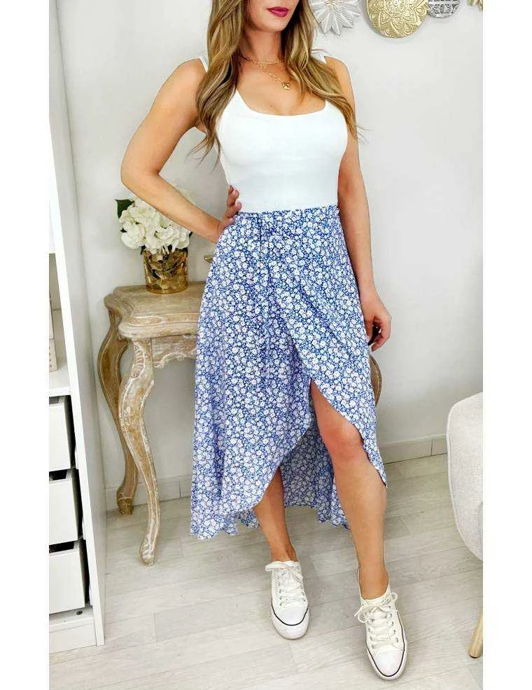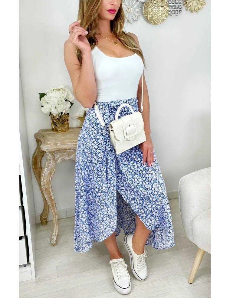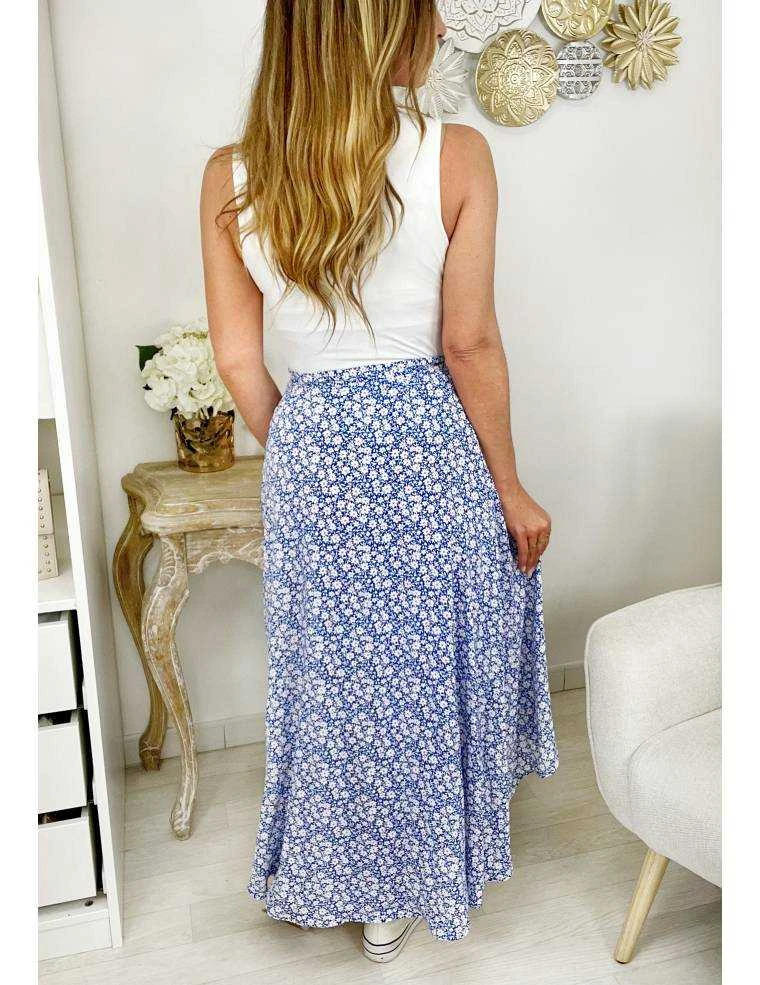 ☆ Jupe longue portefeuille, au fond bleu et petites fleurs blanches et orange, elle se porte droite .