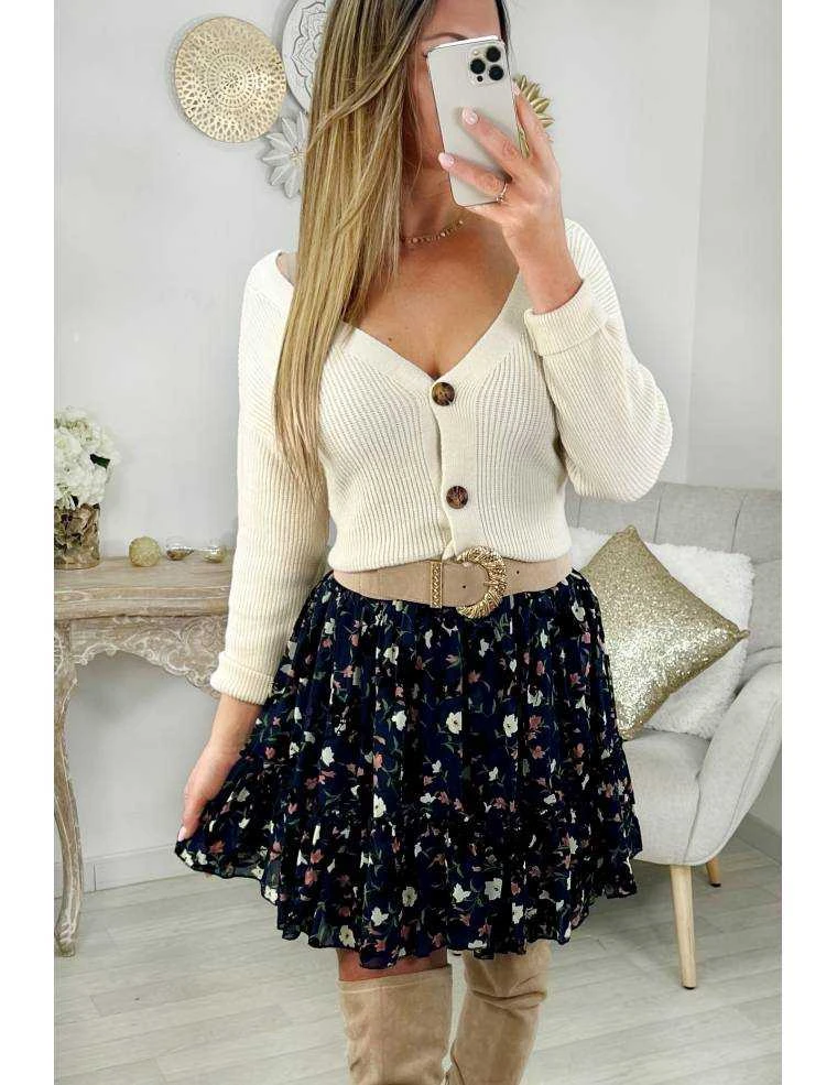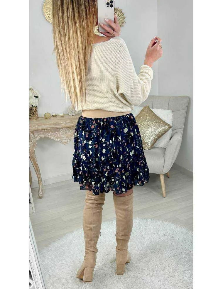 ☆ Petite jupe plissée au fond bleu nuit, imprimé fleurs roses et blanches, elle se porte droite.