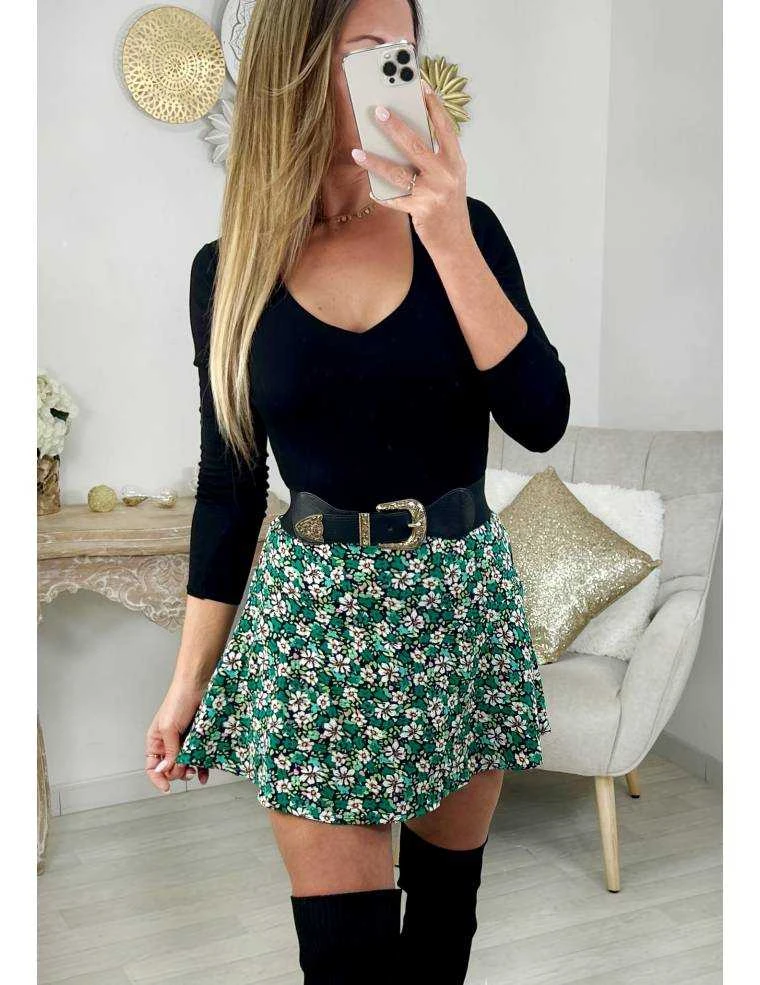 ☆ Jupe short dans les tons fleuris vert blanc et rose,dos smocké ,elle se porte droite.