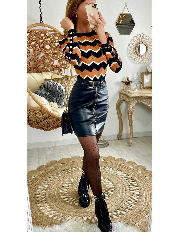 Jupe noire style cuir, taille haute elle se ferme par un zip doré à l’avant, ceinture à double boucles dorées intégrée à l’avant, elle se porte ajustée