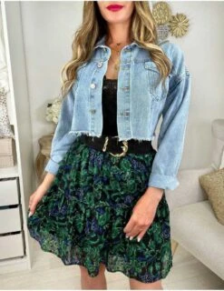 ☆ Jupe à petits volants, doublée,imprimé fleuri dans les tons bleu et vert, taille élastique, elle se porte droite.