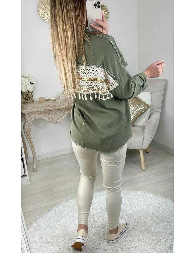 ☆ Veste kaki en jeans, se ferme par six pressions, deux poches sur le buste et coutures « used », dos brodé, sequins, pompons et perles, elle se porte droite.