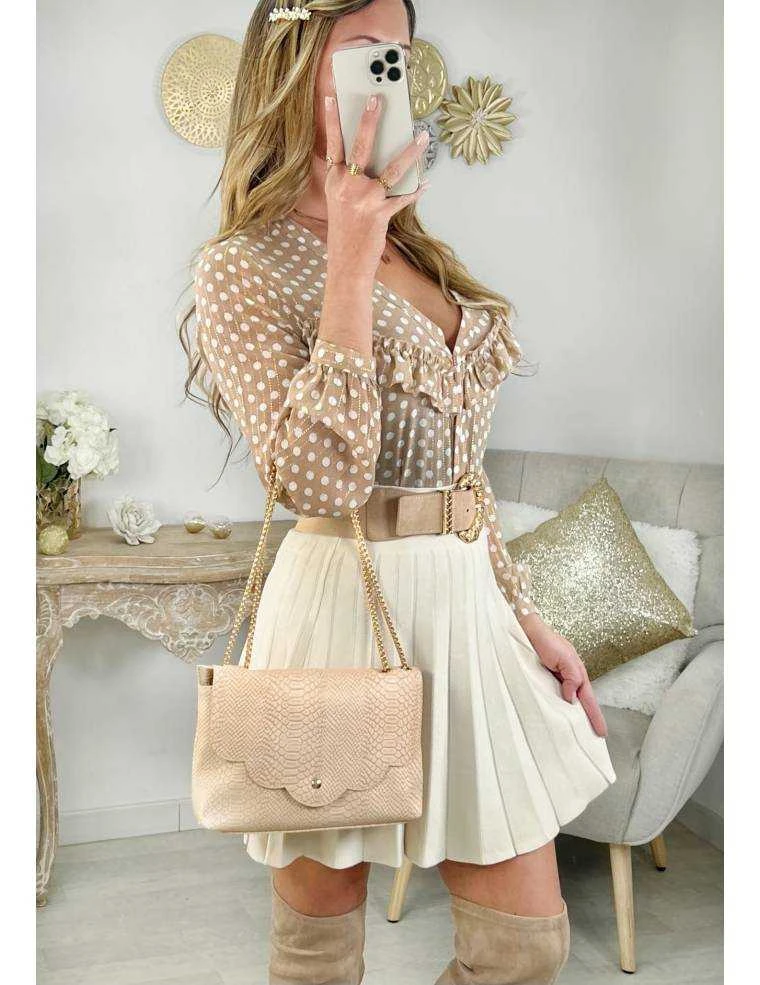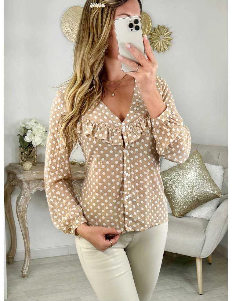 ☆ Chemisier col V à pois » vieux rose », liserés gold et entièrement boutonné il se porte droit.