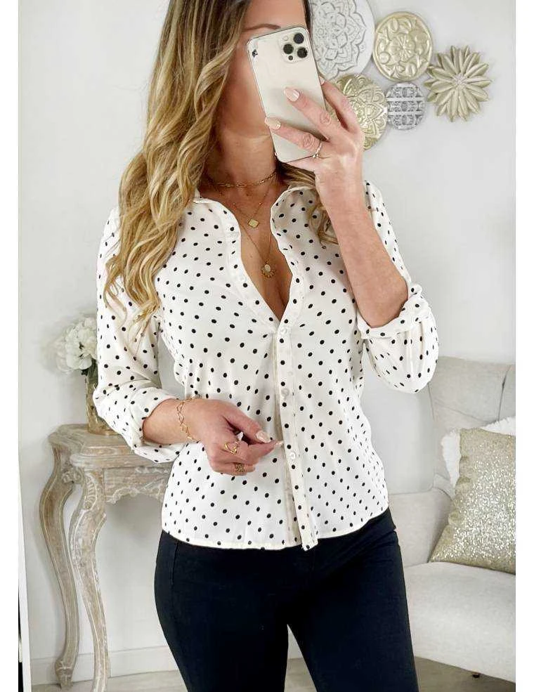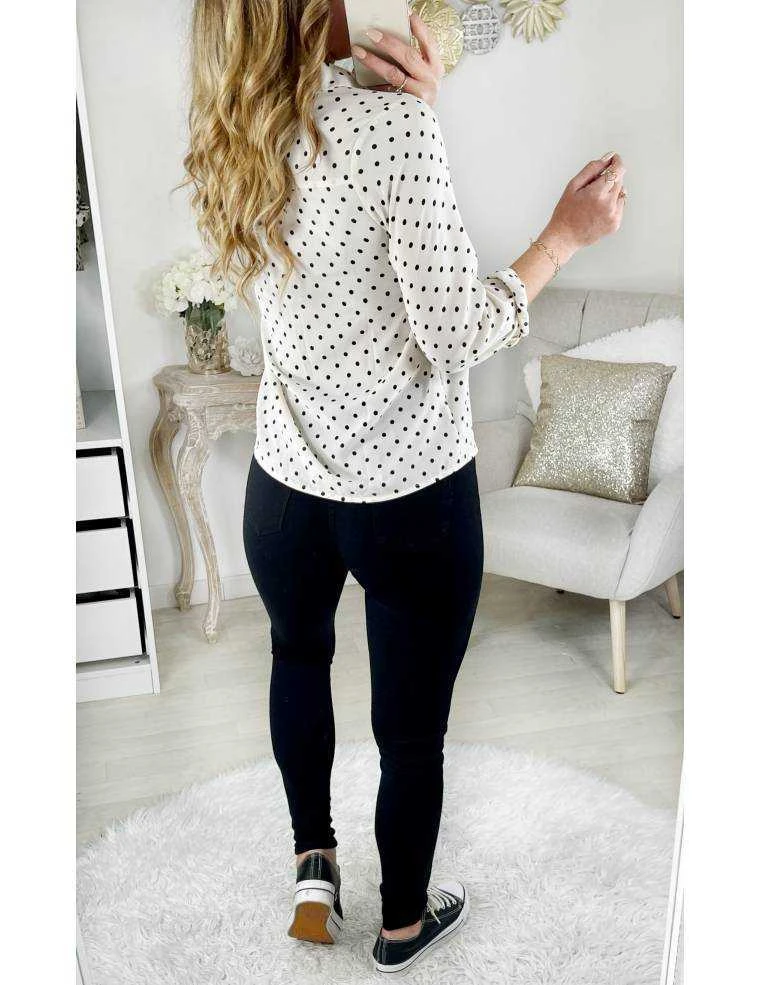 chemisier cream en voilage et jolis pois noirs entièrement boutonné et manches longues, joli col chemisier il se porte droit.
