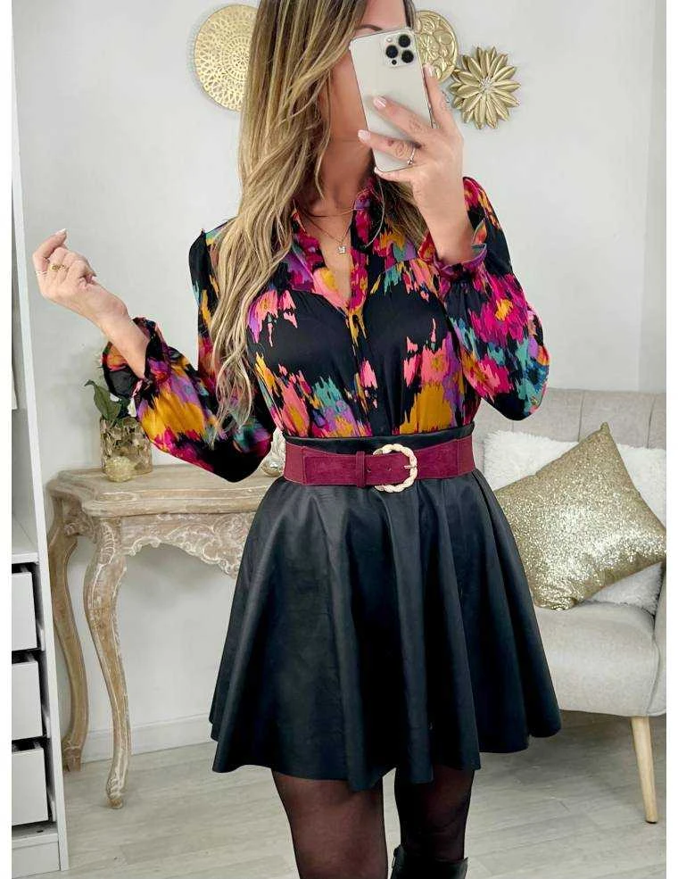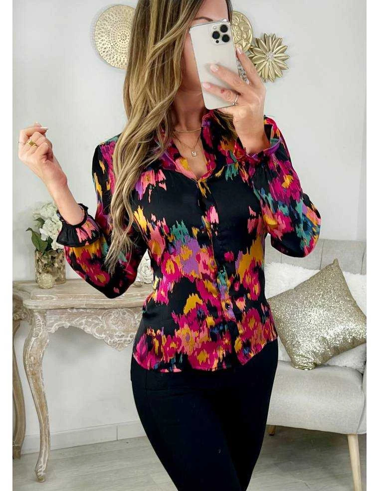 ☆ Chemisier en voilage « blurry flowers » dans les tons noirs, fuchsia, orangé et rose entièrement boutonné,il se porte droit ou ajusté dans un short ou pantalon