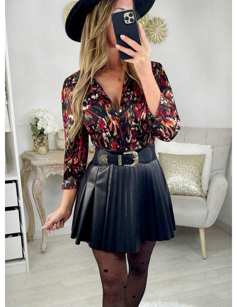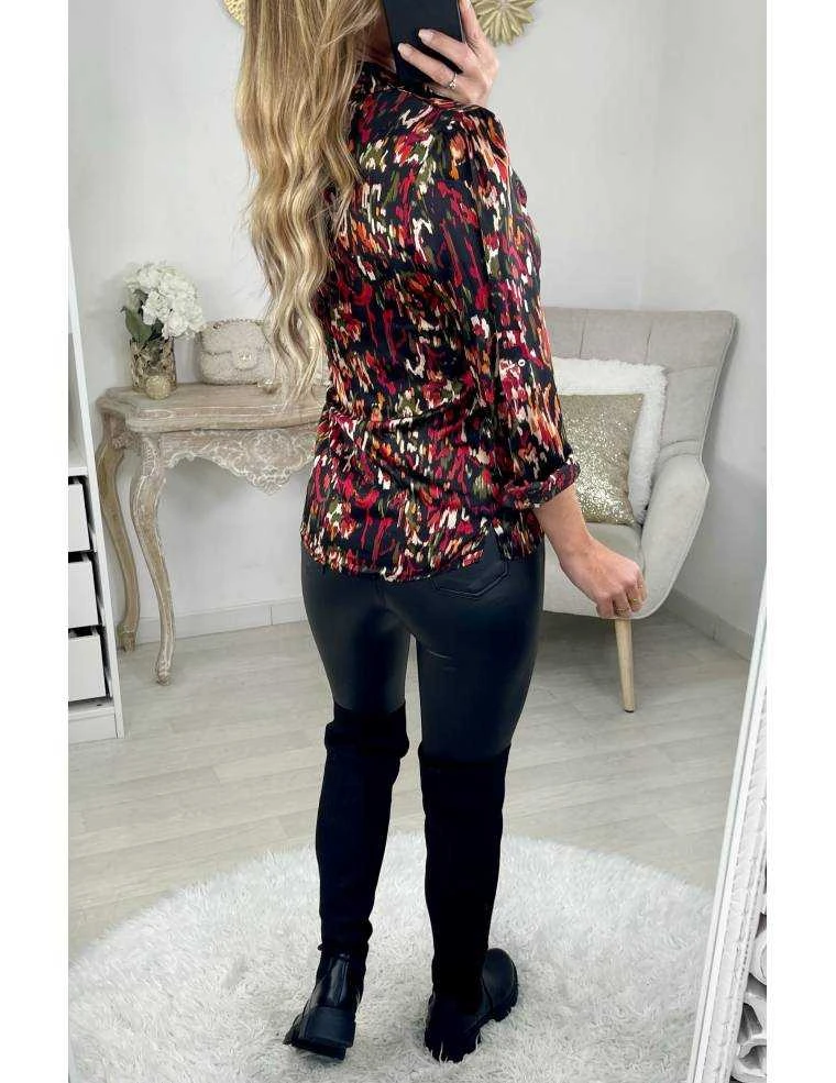 ☆ Chemisier fluide à l’imprimé rouge orangé noir et beige , entièrement boutonné,il se porte droit ou ajusté dans un short ou pantalon