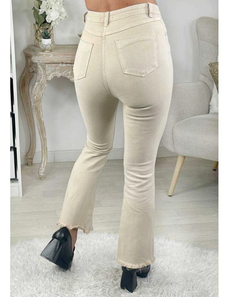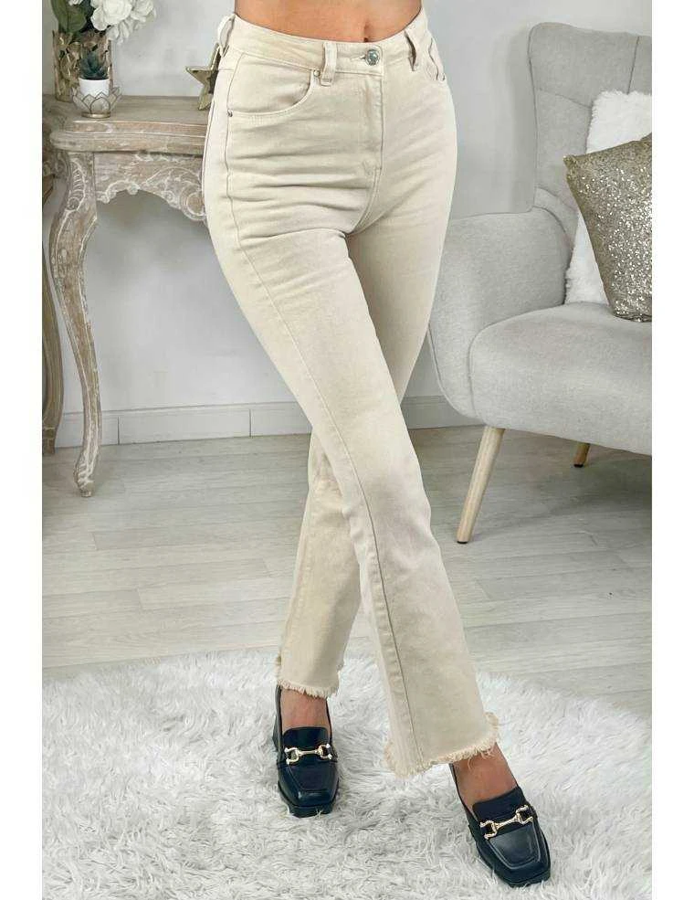 ☆ Jeans flare beige et taille haute se fermant par un zip et un bouton , 2 poches à l’avant, 2 poches à l’arrière,il se porte moulant.