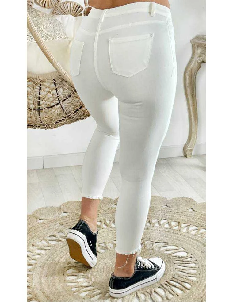 Jeans slim blanc, en tissu souple et taille moyenne, légèrement usé sur le bas , 2 poches à l’avant, 2 poches à l’arrière et effet push up, il se porte moulant.