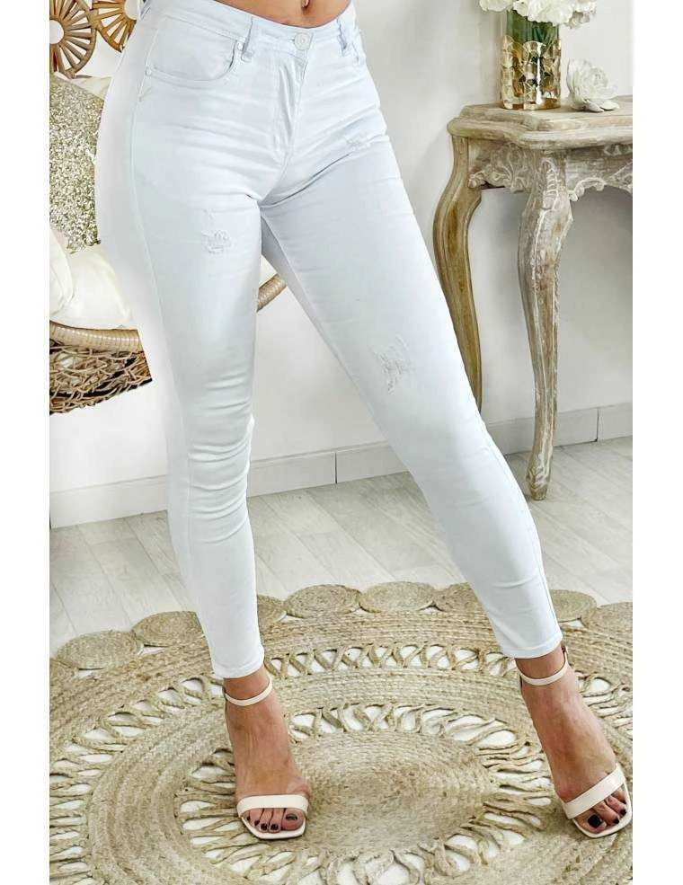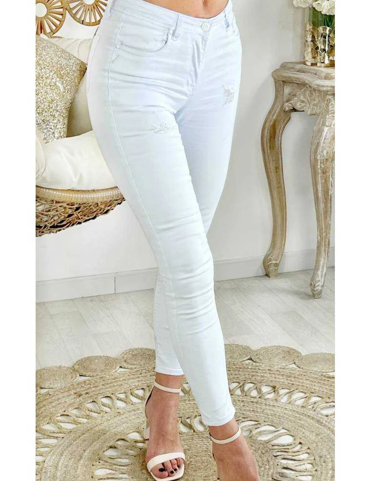 Jeans slim blanc, en tissu souple et taille moyenne, lĂ©gèrement usĂ© sur le bas et les jambes , 2 poches Ă l’avant, taille Ă©lastiquĂ©, 2 poches Ă l’arrière et effet push up, il se porte moulant.
