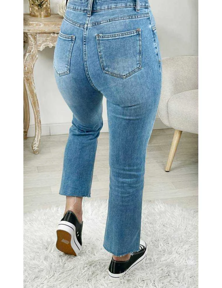 Jeans Flare, bleu moyen et taille haute, il se porte moulant.( évasé sur le bas)