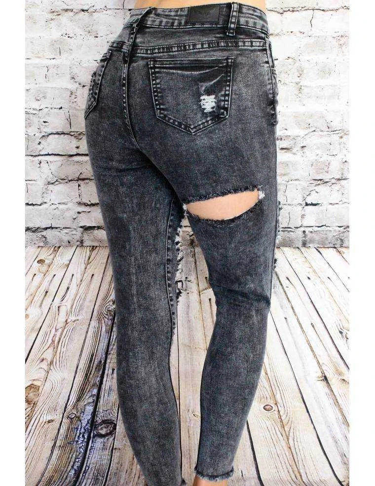 Jeans gris délavé coupe ajustée avec larges ouvertures devant, et une déchirure sous les fesses, taille haute, 4 poches, il se ferme par un bouton, il se porte moulant.