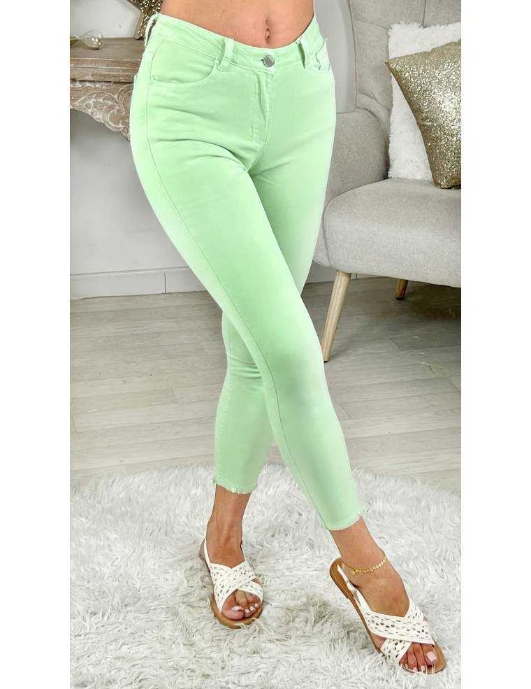 ☆ Jeans slim vert d’eau , quatre poches, se ferme par un bouton et un zip.