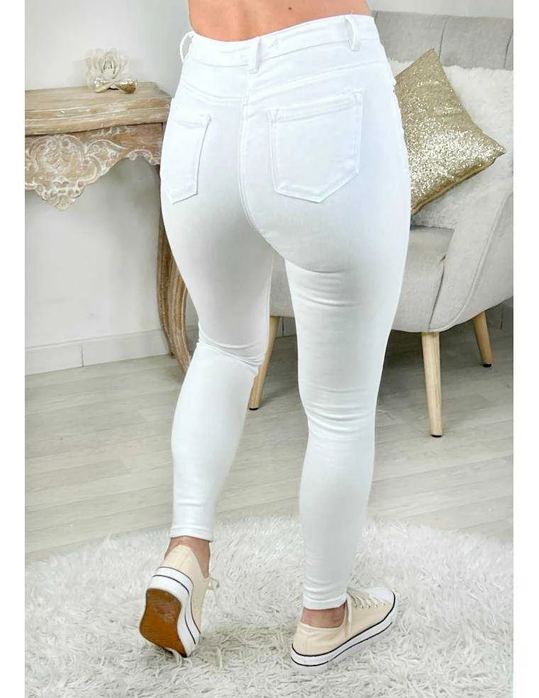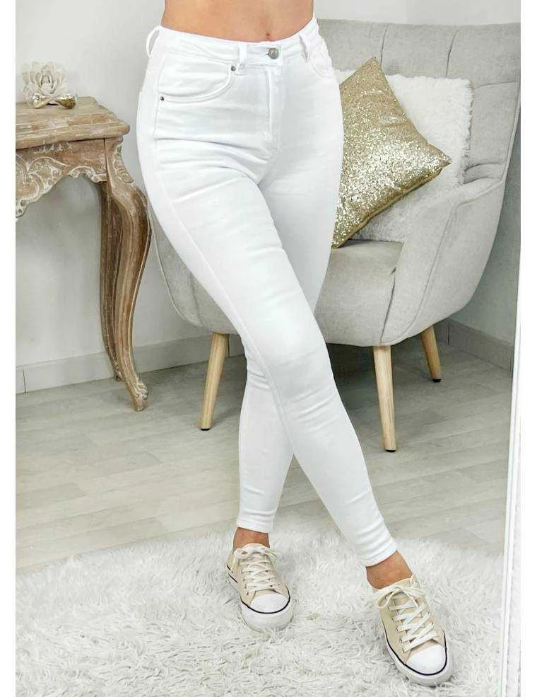 ☆ Jeans slim blanc taille haute se fermant par un zip et un bouton , 2 poches à l’avant, 2 poches à l’arrière,il se porte moulant.