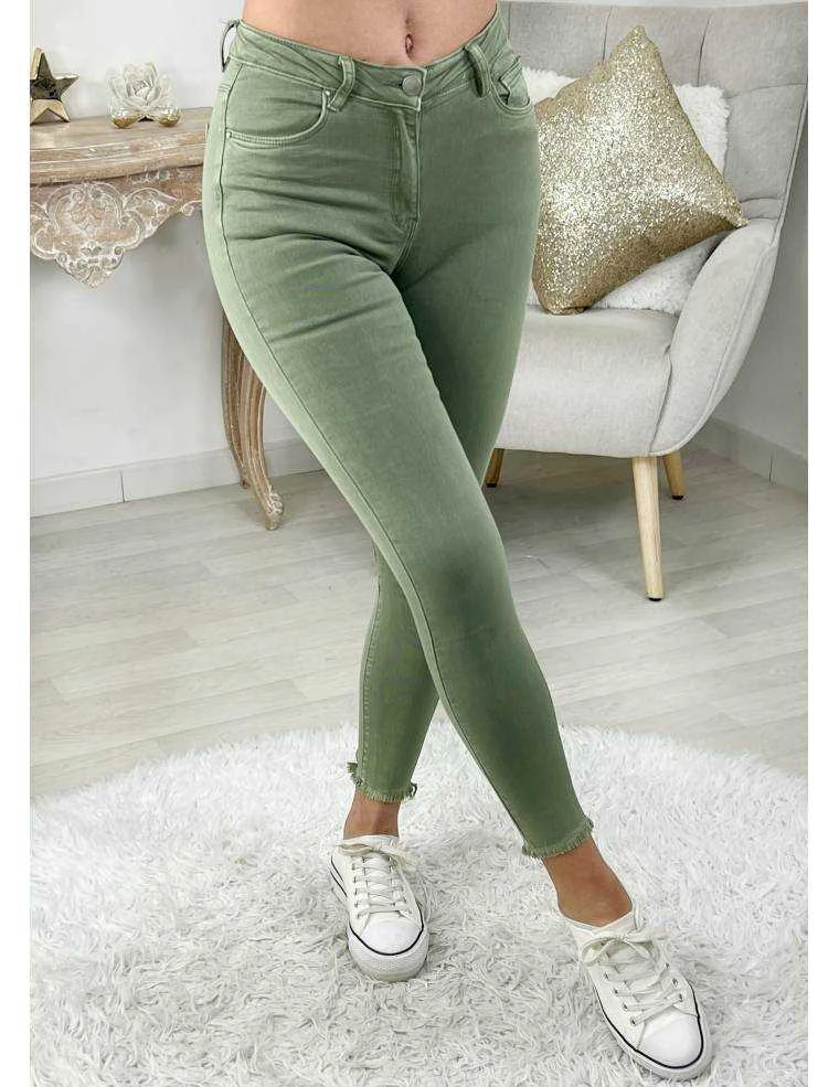 ☆ Jeans vert olive taille haute, 4 poches, bas usé,se ferme par un bouton et un zip, il se porte ajusté.