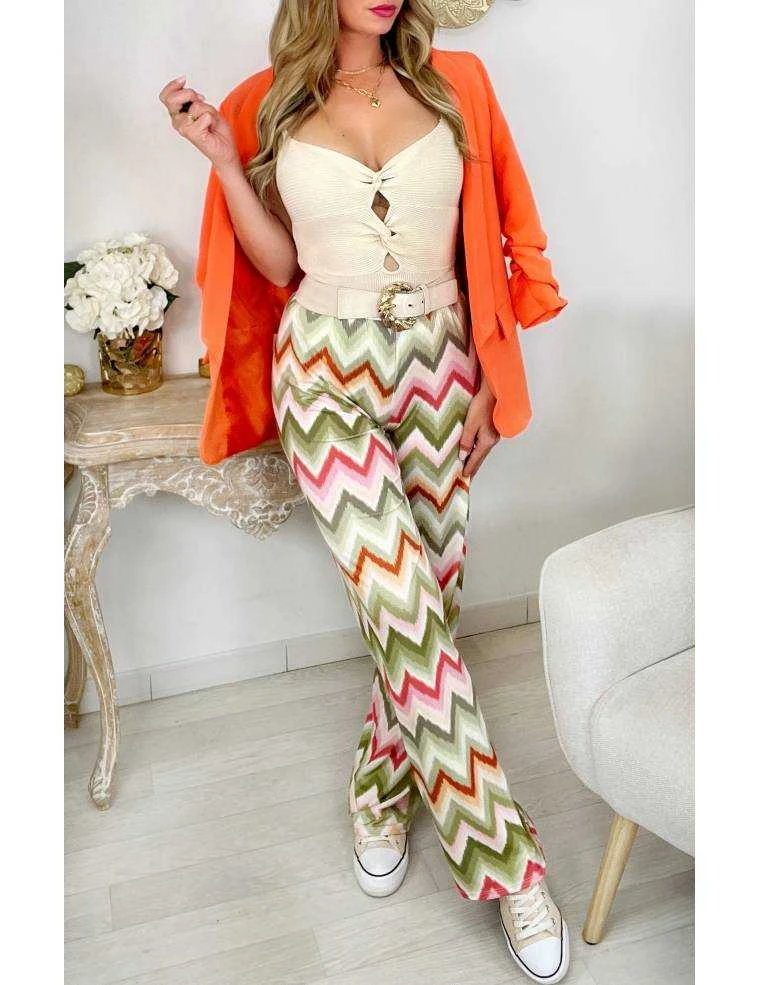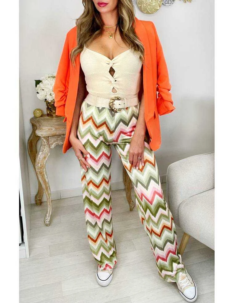 ☆ Pantalon droit dans les tons vert amande, kaki, rose et orange, taille élastique, il se porte droit.