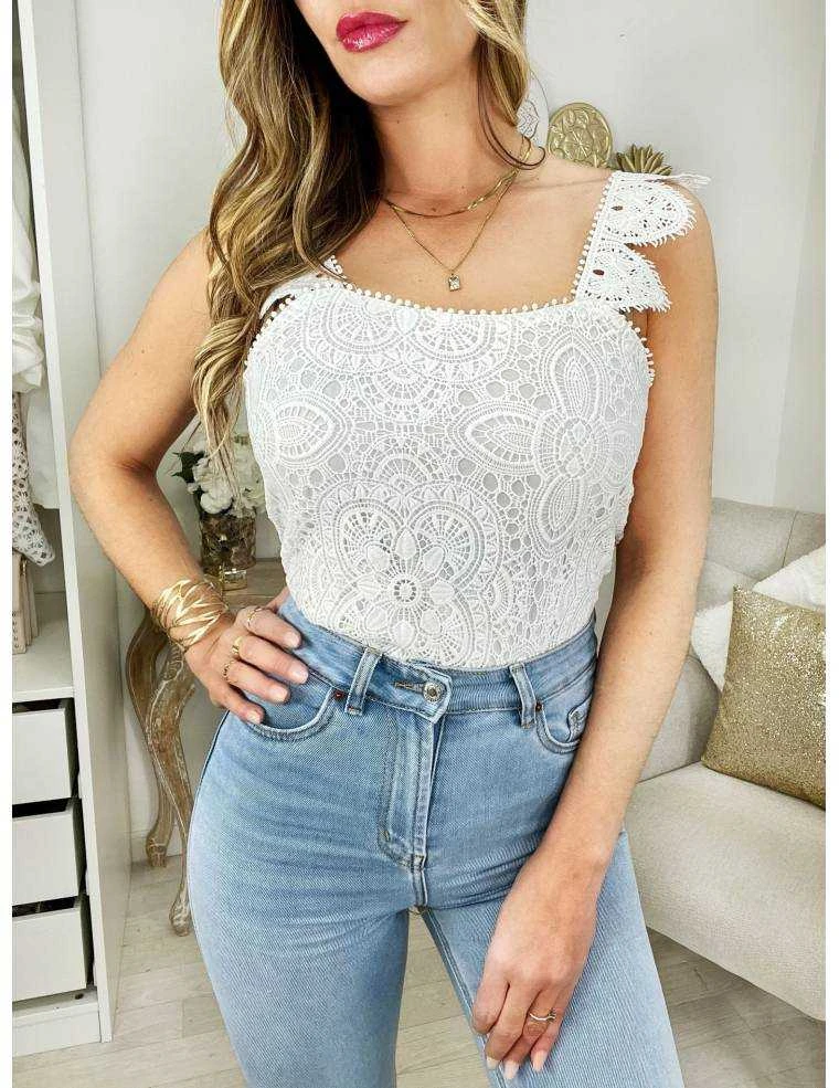 ☆ Top blanc tout en broderie,col carré et larges bretelles il se porte droit ou plus ajusté dans un jeans.