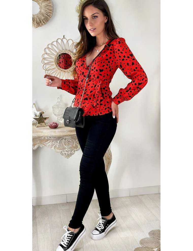 Top cache coeur et lien à nouer autour de la taille, fond rouge et points noirs, manches longues boutonnées, il se porte ajusté.