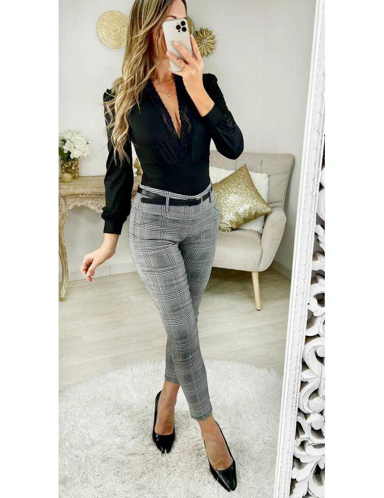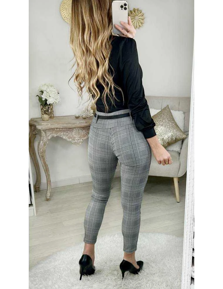 ☆ pantalon en tissu stretch à carreaux , large ceinture élastiquée et taille haute,ceinture noire style cuir, il se porte très près du corps.