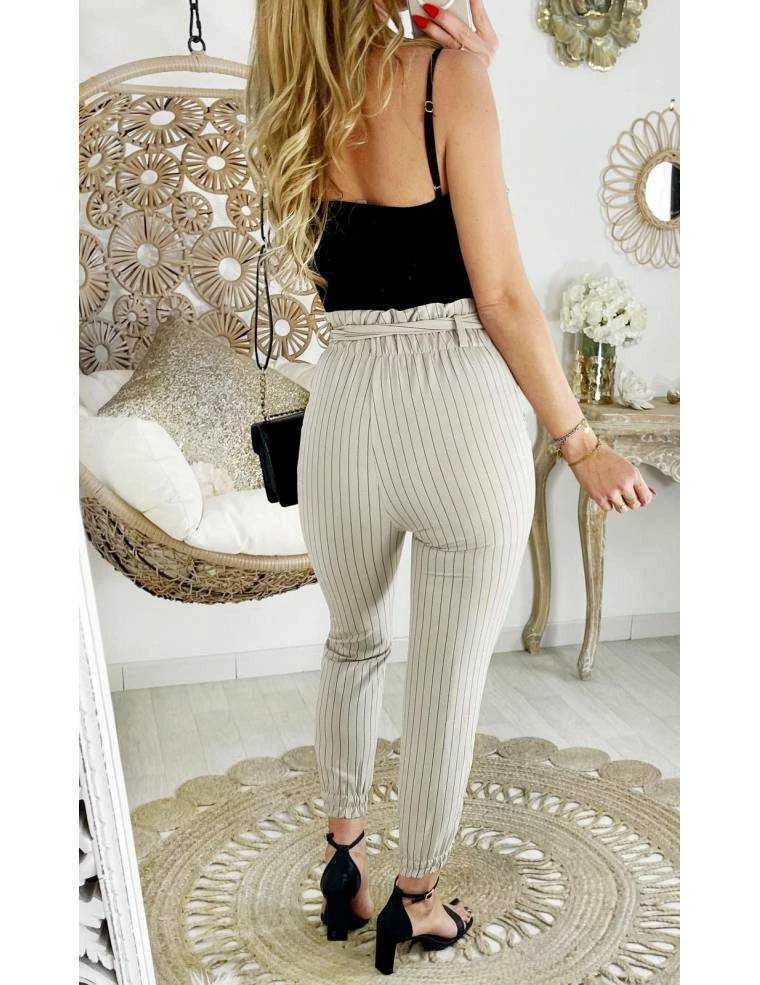 Pantalon droit et fluide beige à rayures noires, 2 poches plaquées à l’avant, taille haute et ceinture en tissu pour marquer la taille, bas resserré, il se porte droit.