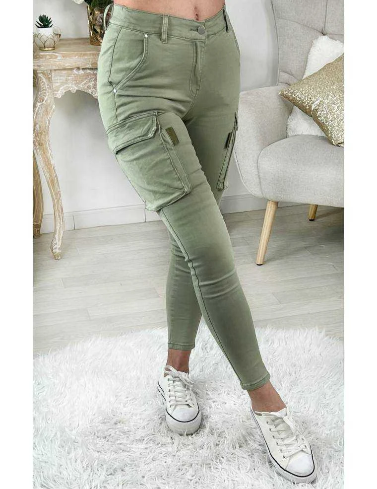 Pantalon kaki taille moyenne, 4 poches, poches chino à l’arrière ,se ferme par un bouton, deux poches sur les cuisses et resserré sur le bas, il se porte ajusté.