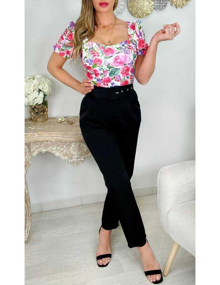 ☆ Pantalon noir, se ferme par un zip et un bouton, ceinture en tiss et boucle carrée,il se porte droit.