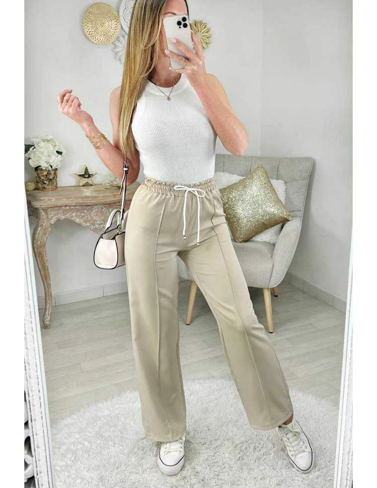 â Pantalon style jogging beige, lien Ă nouer, taille Ă©lastique, bas Ă©vasĂ©, il se porte droit.