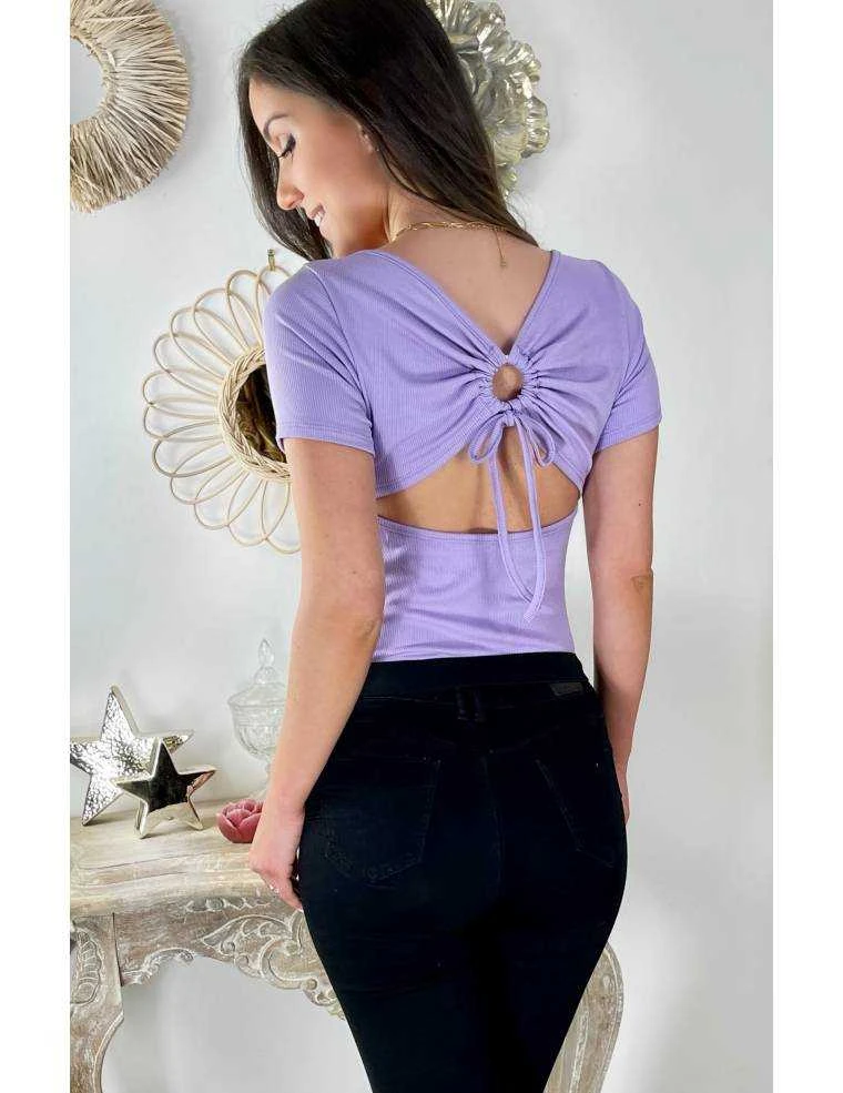 body en tissu côtelé lila, col rond et manches courtes, dos ajouré, anneau et lien à nouer, il se porte ajusté.