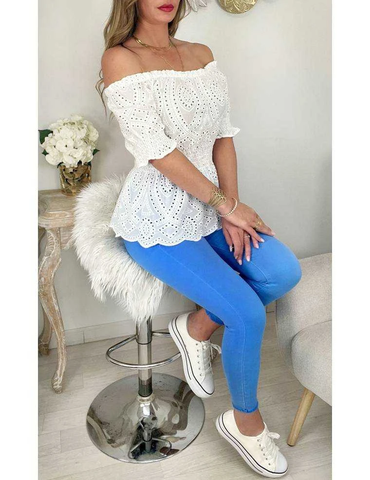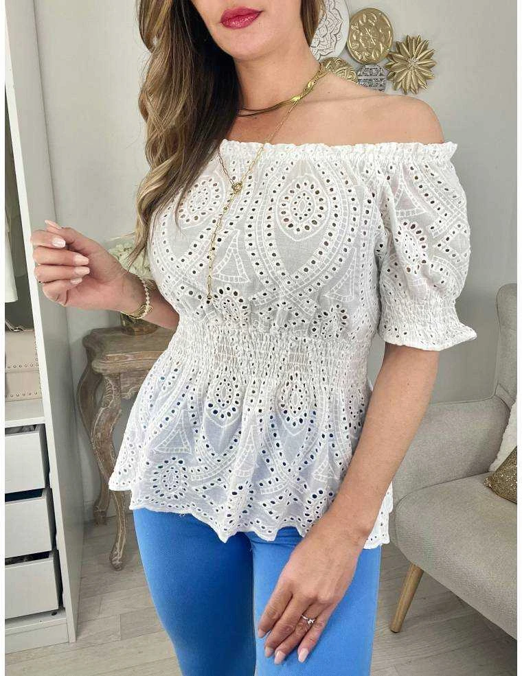 ☆ top blanc tout en broderie, manches courtes et taille smockée, épaules dénudées, il se porte droit..