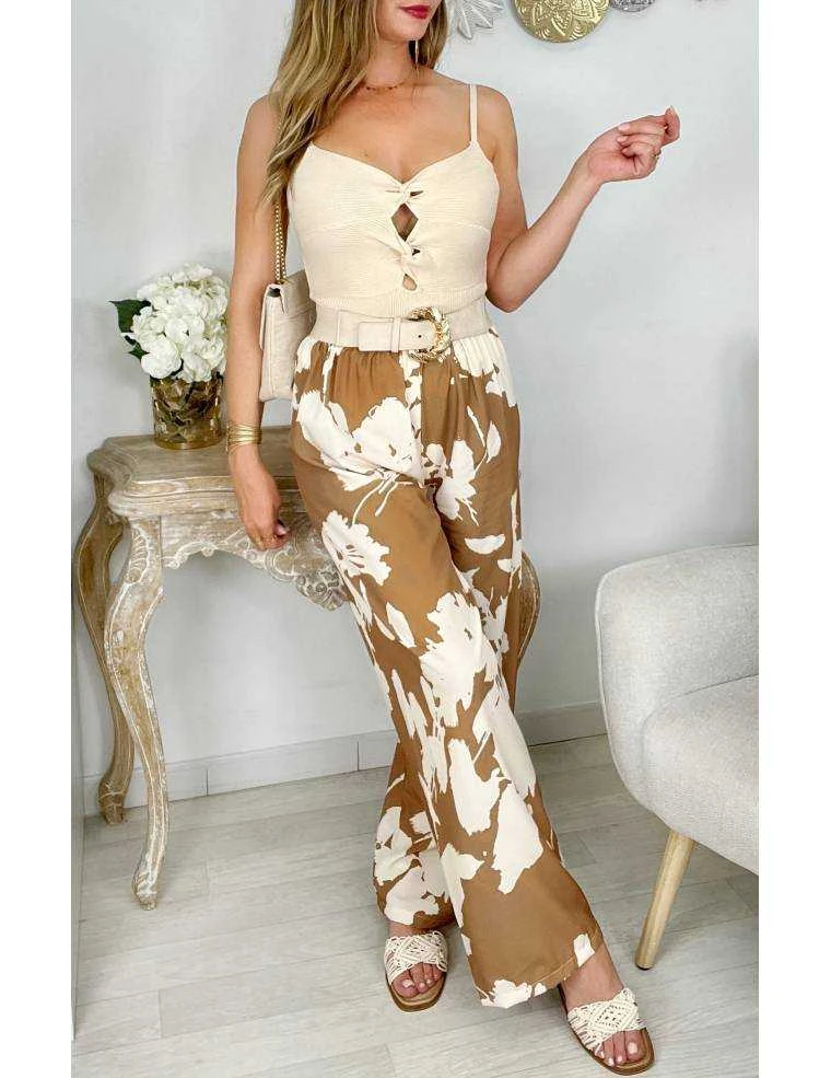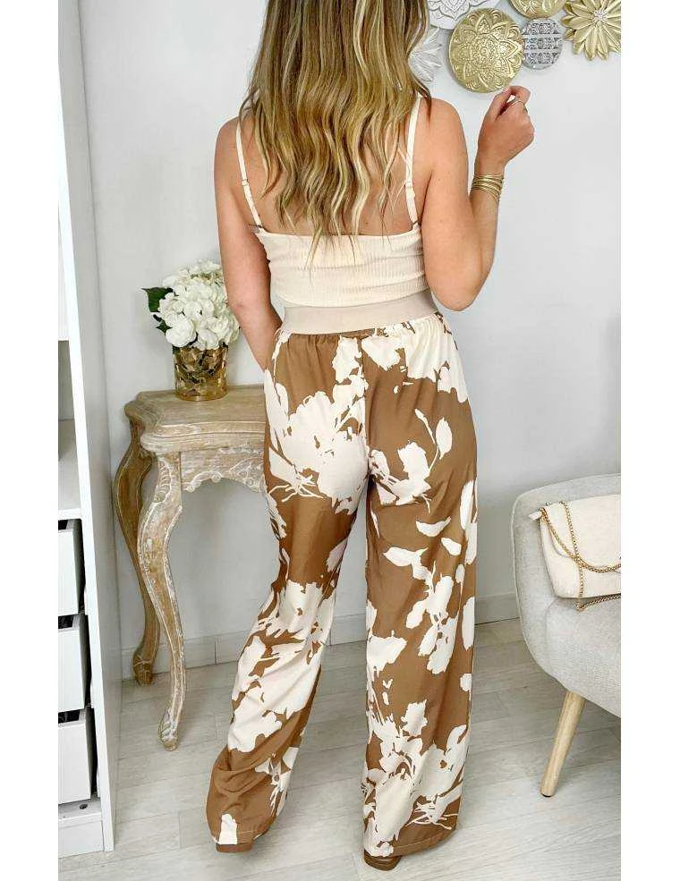 ☆ Pantalon fluide à l’imprimé beige et caramel, taille élastique, il se porte droit.
