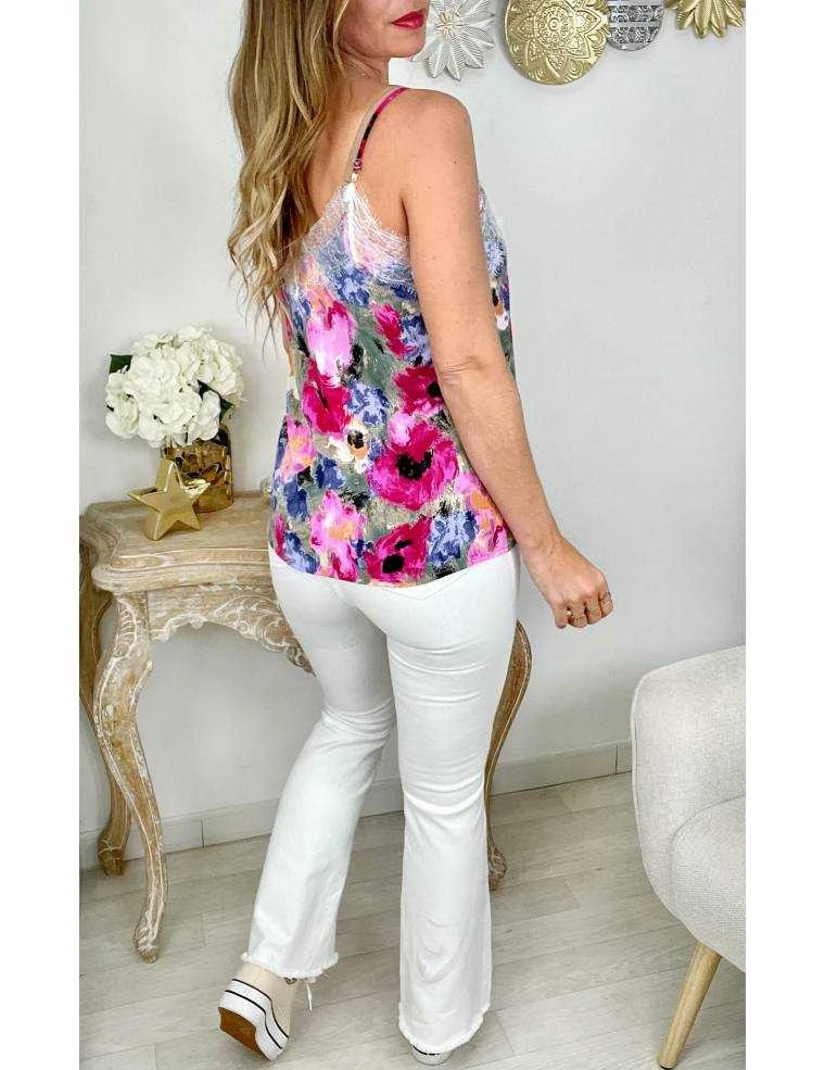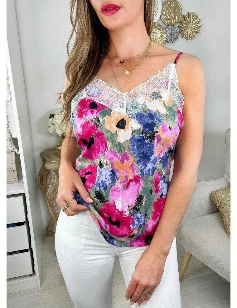 ☆ top fluide , fies bretelles réglables, col v dentelle, imprimé fleuri dans les tons fuchsia rose et purple, il se porte droit ou ajusté dans un jeans ou un short.