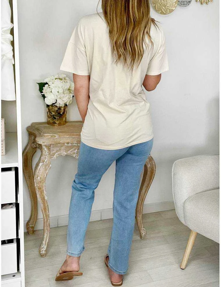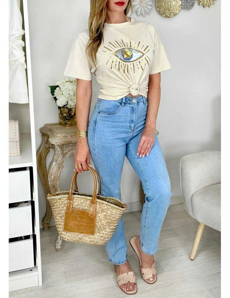 ☆ Tee shirt beige motif » oeil porte bonheur » en sequins « , il se porte oversize , noué ou plus ajusté à l’intérieur d’un jeans .