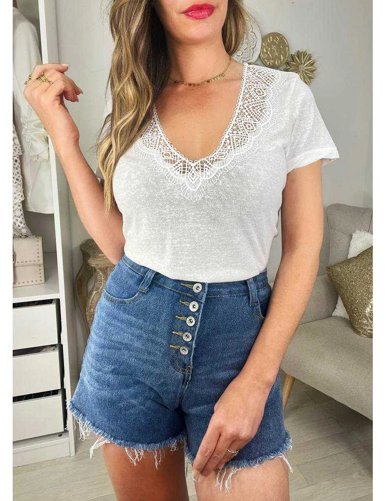 ☆ top blanc manches courtes et col v brodé, il se porte droit..